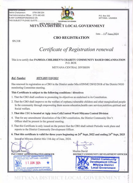 Inspired by a life-changing event, Pamoja Children's Charity Community Based Organization. was established in 2019 in Mityana, Uganda. Over the years, we have become one of the most trusted and effective charitable organization, working hard to improve the lives of those in need.Most especially, we strive to lessen their hardships by serving them with all the love God has put into our hearts. As Mother Theresa said, “It’s not how much we do, but how much love we put into the doing.”